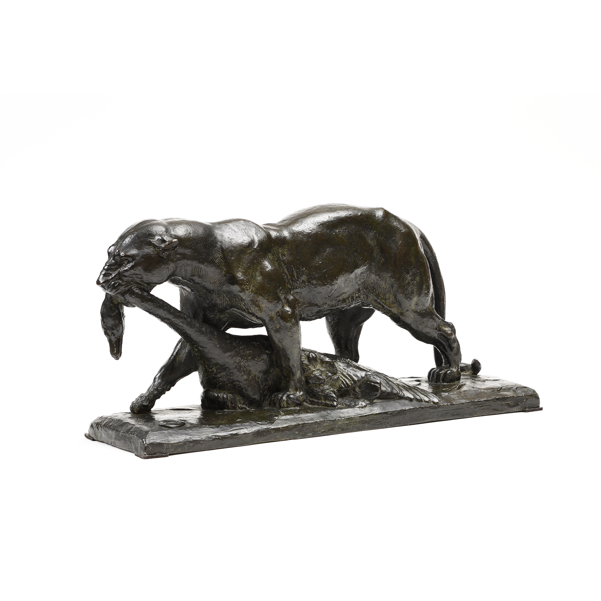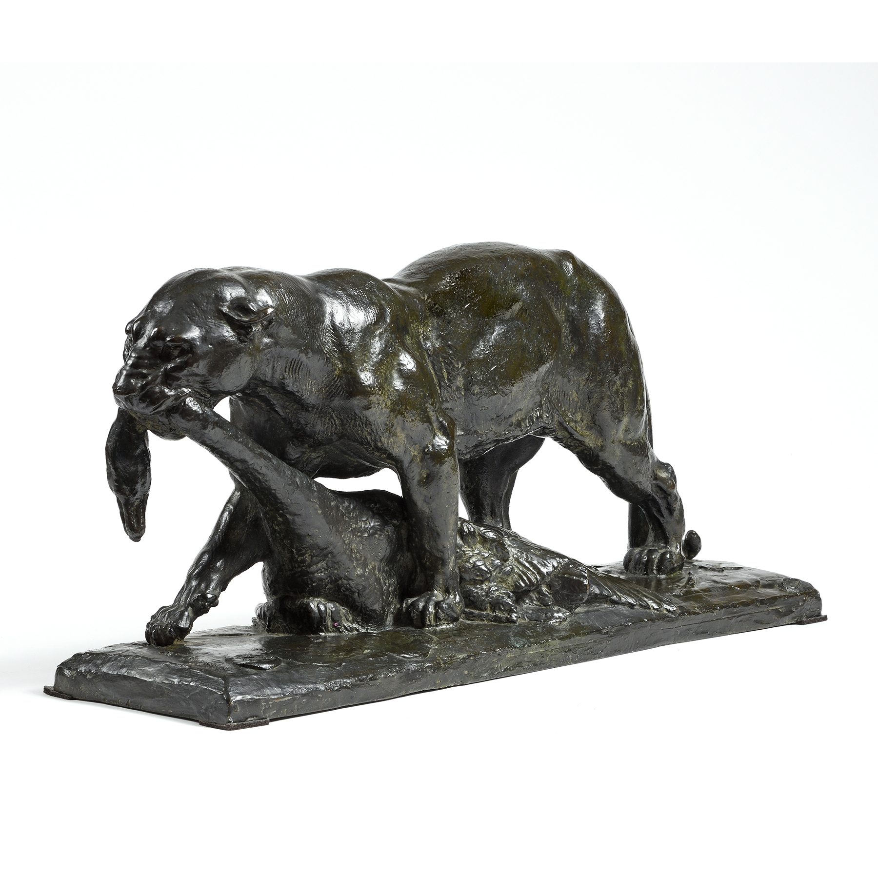 La deuxième sculpture que le visiteur peut contempler en approchant du Pavillon des Beaux-Arts était encore un combat bestial, puisque dans les mâchoires de la panthère d’Auguste Seysses pendait le cou d’un cygne